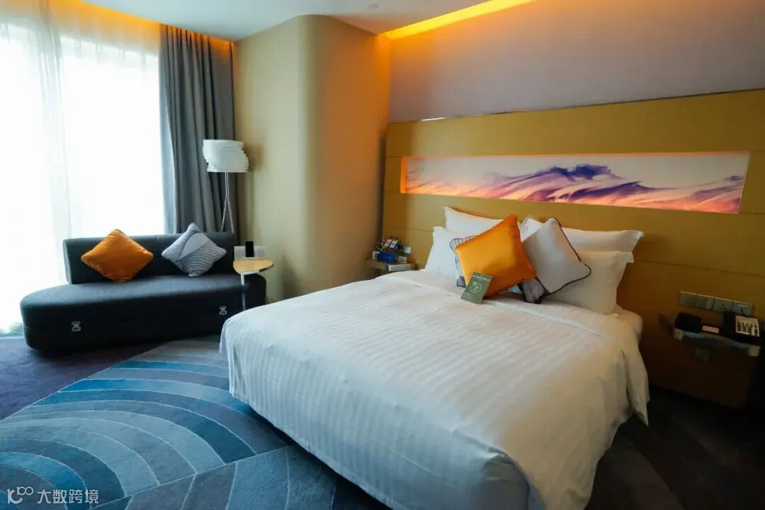 599元、799元给到的是城景大床房1晚或者2晚连住,给到的是双人江景自助早餐、鸡尾酒小食套餐.云端江景酒吧、首轮迷你吧免费、时令果盘等,房间充满艺术设计气息。