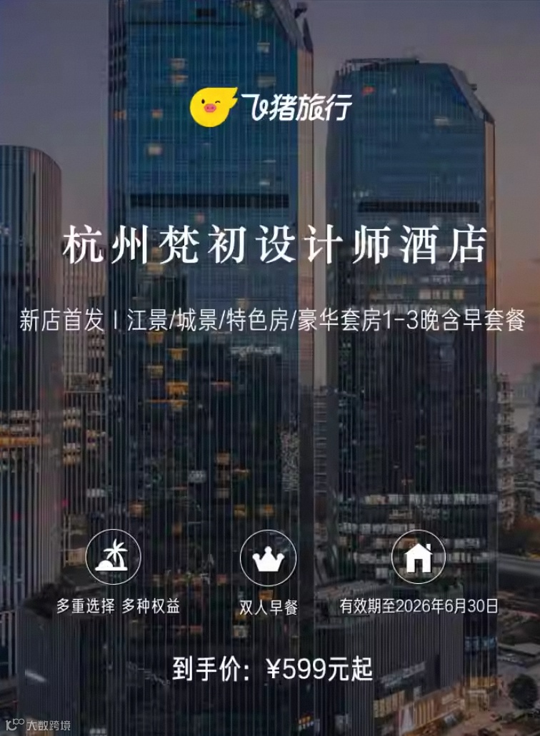 【全程不加价】杭州梵初设计师酒店1晚含早特惠套餐=599元起