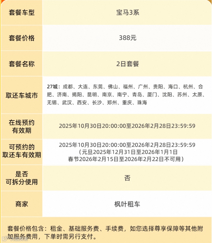 [枫叶租车]宝马3系27城通兑2日尝鲜卡