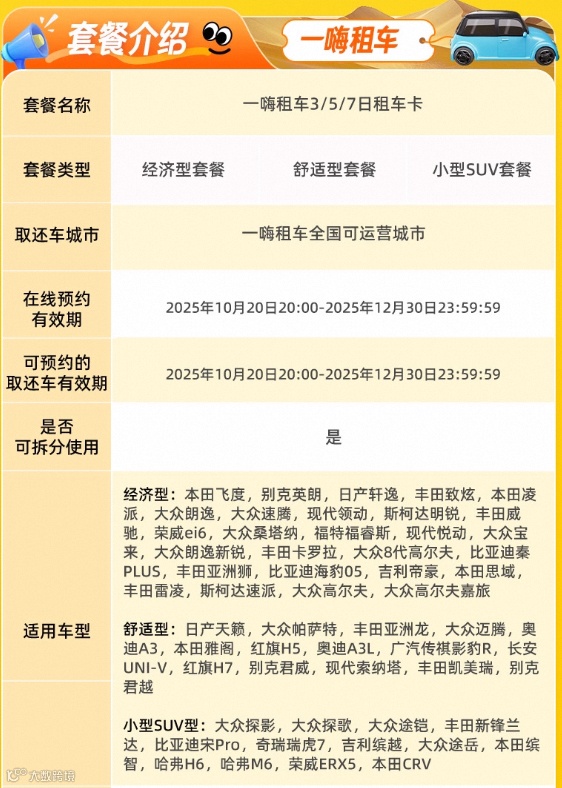 这个飞猪官方租车卡,后面的套餐也很划算,一天仅需66元就可以租全国29城的经济型车型,出行日期包含从现在到26年1月5日