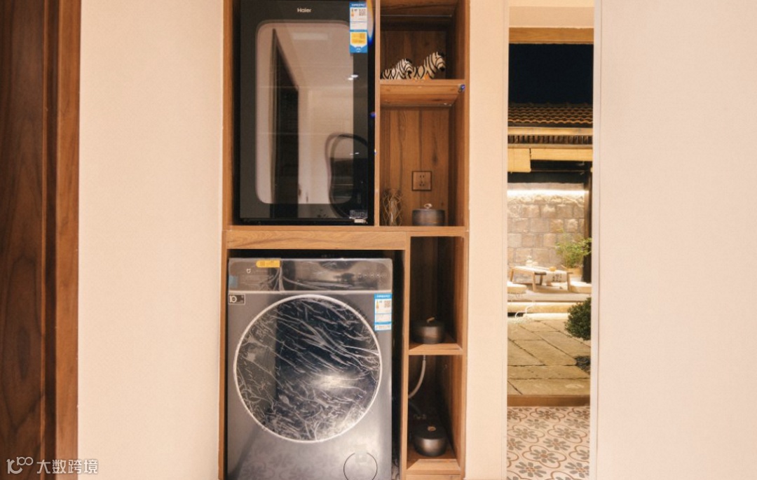 厨房有微波炉、冰箱、洗衣机,还有一些简易的厨具。