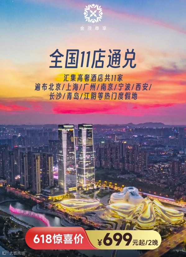 金茂通兑金茂酒店9城11店3天2晚通兑含西安/北京/长沙/上海等地(金茂品牌诚意之作,含两晚699起)