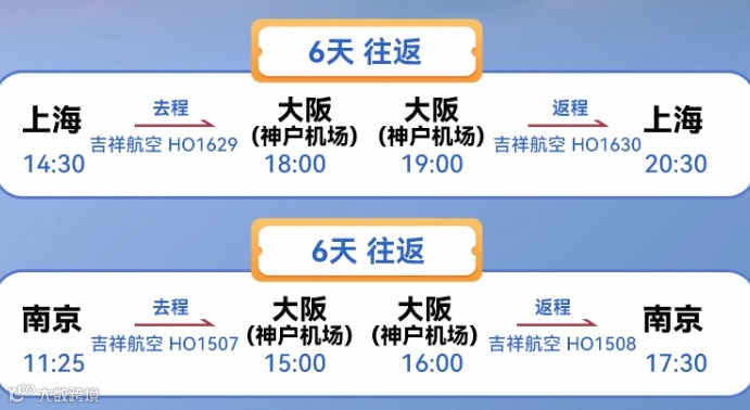 ✔吉祥航空承运!上海/南京6日往返大阪神户机场,含2件23kg+10kg行李额