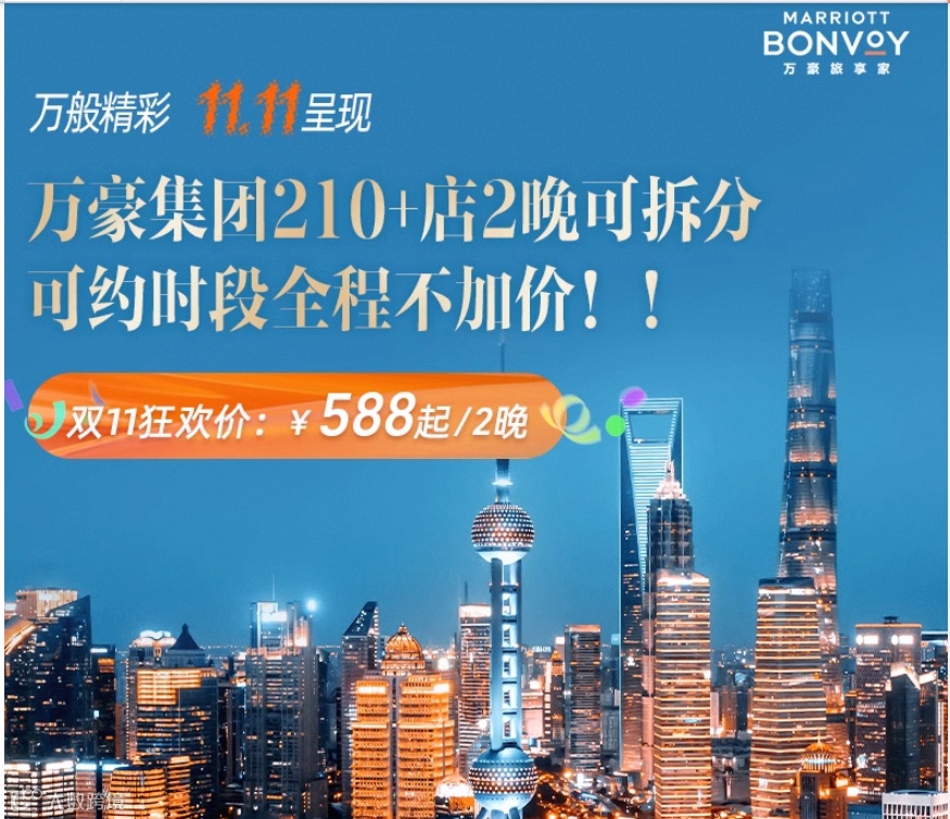万豪集团全国多地320+店2晚可拆分多档通兑+双人早餐