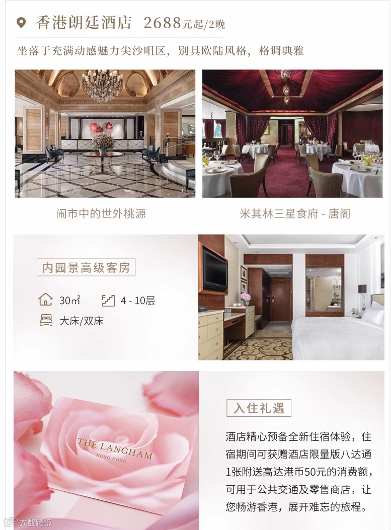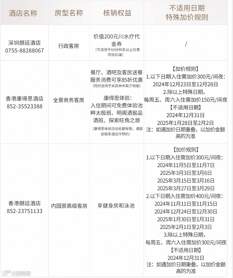2688元档位的包括深圳朗廷酒店、香港康得思酒店、香港朗廷酒店,同样也给到了丰富的核销权益: