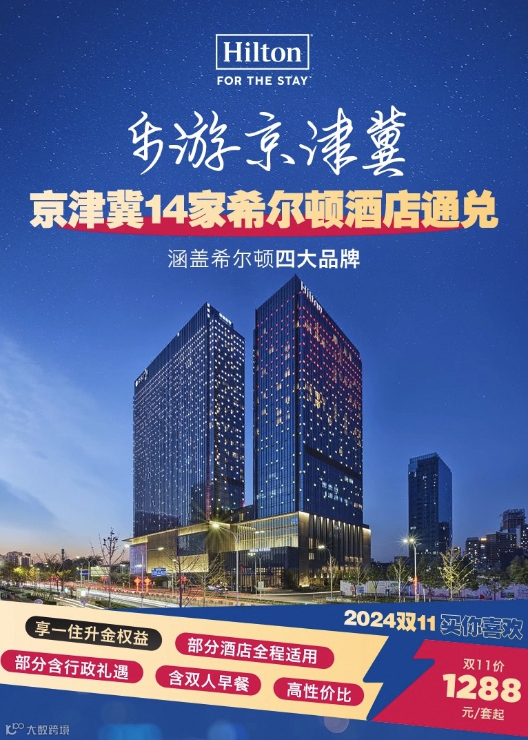2.【双11超级VIP】一住升金!希尔顿京津冀14店2晚通兑部分行政礼遇=1288元起/套起