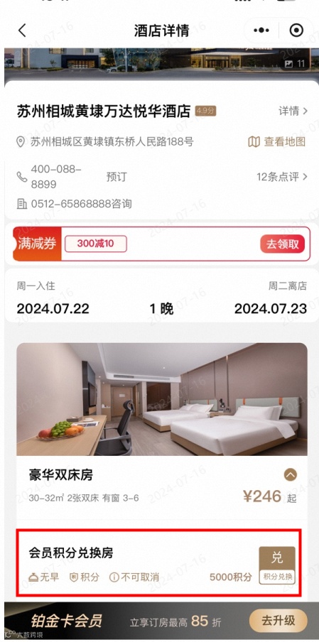 这次直接加赠10000积分,可以兑换1晚三亚海棠湾万达嘉华(这家店国庆也是可以兑换的),或是兑换部分酒店2晚(如广州嘉华/苏州悦华等)!