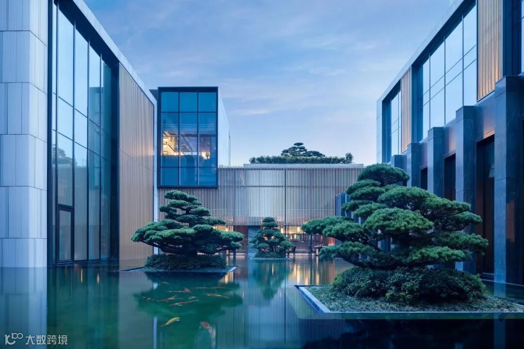 大中华地区首家度假型柏悦酒店,酒店靠着东钱湖,占地面积近10万平米,由古村落改建而成,形成白墙黑瓦的建筑群。