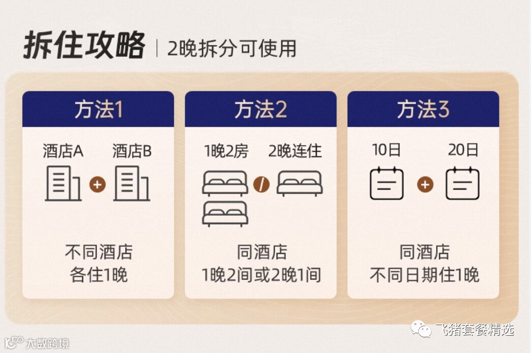 2晚可拆分可以给大家普及下,总共3种攻略:不同酒店各住1晚、同酒店1晚2间或2晚1间、同酒店不同日期住1晚,可以说是相当灵活了。