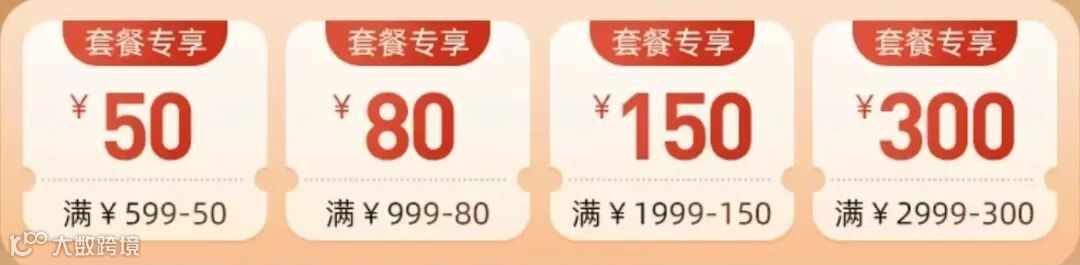 套餐有两档价位可选,在套餐页面里也可以直领该产品指定300元或400元减免优惠券,先领券再下单: