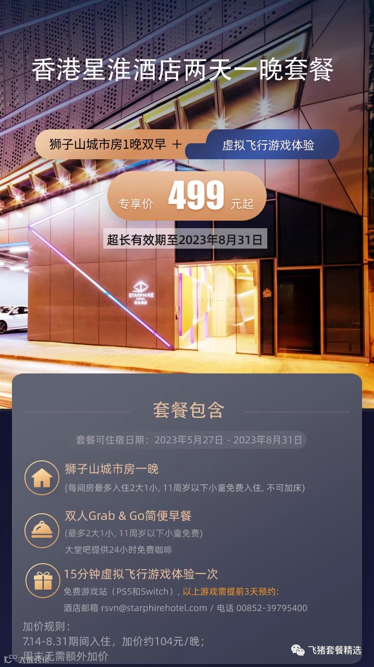 4、【618暑促】香港星淮酒店1晚獅子山城市房+早餐+虚拟飞行游戏体验 = 499元