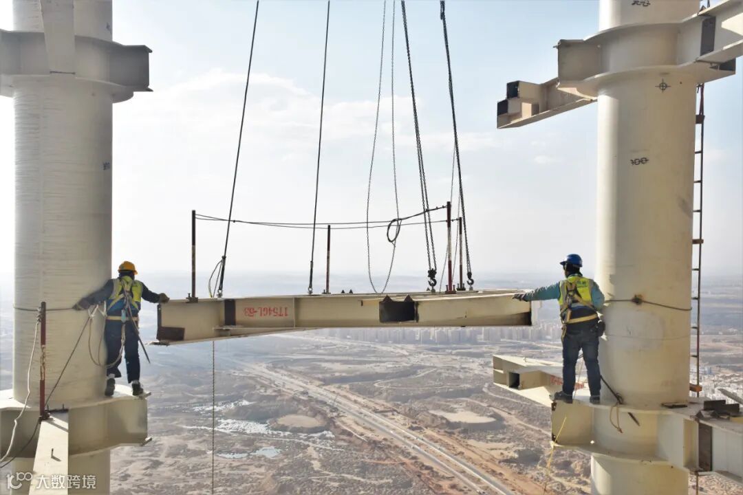 ▲安装工们正在安装吊上空中的钢梁