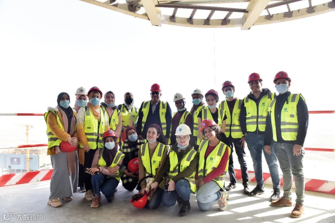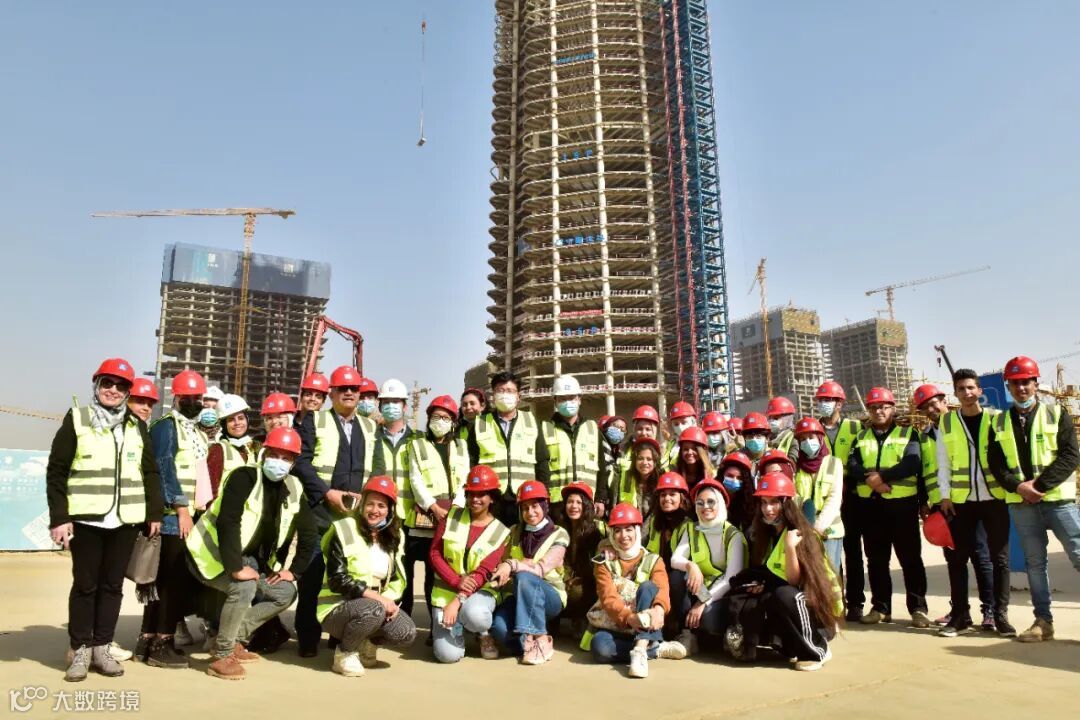 开罗时间12月8日上午,中建埃及在CBD标志塔项目举行高校交流日活动。埃及苏伊士运河大学语言学院院长、孔子学院埃方院长兼埃及英国大学中文系主任哈桑(Hassan),埃及苏伊士运河大学孔子学院中方院长朱廷婷,分别带领两所高校的40名大学生来到项目现场参观交流。