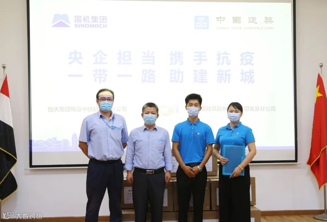 开罗时间9月9日上午,埃及中纺机无纺布有限公司常务副总经理崔洪亮、财务总监李季斌,驱车来到中建埃及新首都CBD项目现场,将十余箱共计两万个医用防护口罩赠送给中建埃及分公司,受到中建埃及分公司副总经理李新学、综合管理部经理郭翔宇的热情欢迎和衷心感谢。