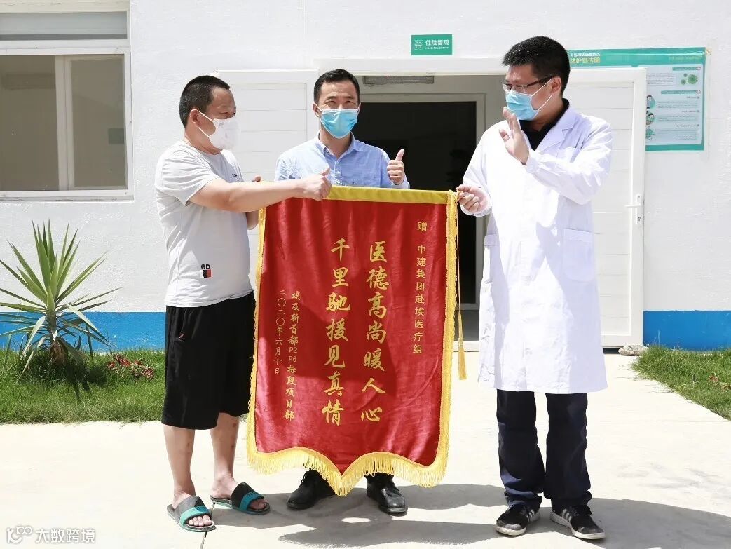 6月10日上午,两面倾注患者韩师傅和患者所在中建埃及新首都CBD项目P2&P6标段无限感激的锦旗,送到了中建赴埃医疗组组长段振平和中建CBD诊所负责人陈玉明手中。