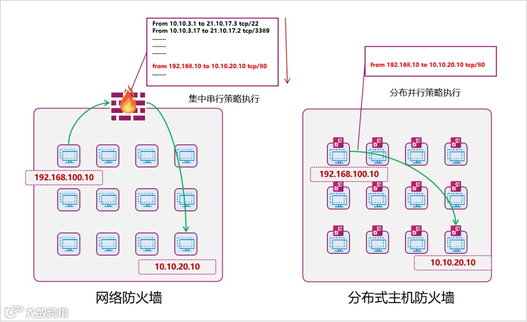 用主机防火墙比用网络防火墙快的另一个重要原因就是,网络流量的访问路径要少一半!如果用网络防火墙做访问,要求流量先从源端引流到防火墙,再从防火墙回到目的端,事实上让网络的路径边长变慢了。而如果用主机防火墙,就直接从源端到目的端就可以了,访问速度自然就快了,同时还避免了由网络防火墙处理能力导致的网络拥塞和单点失败。