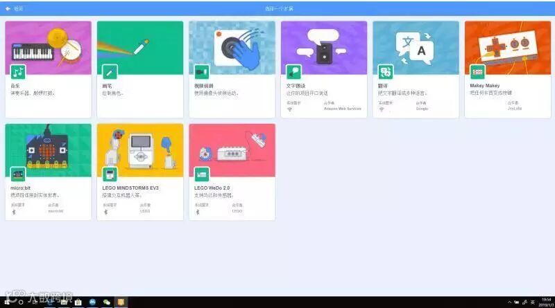 2.0中更多积木分类下的添加扩展,作为一个大类单独分离出来。而版本2.0中的画笔、音乐演奏、视频侦测等相关分类及指令都作为了扩展模块,用户需要点击添加扩展才可以使用;