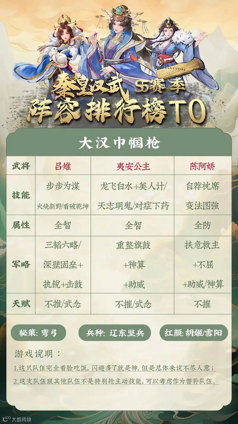 秦始皇核心队:秦始皇提供破甲与属性增益,搭配蒙恬、巴清形成反击盾体系。