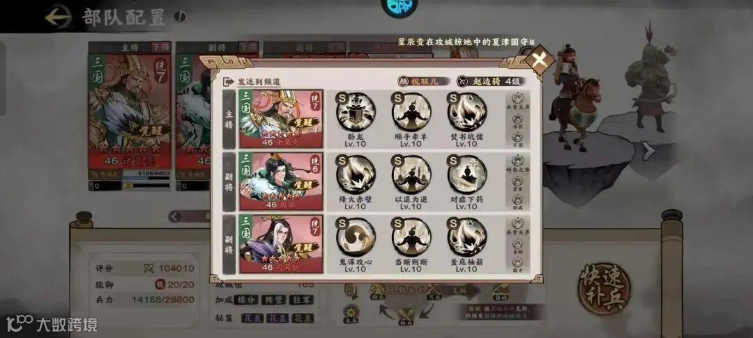 田忌赛马:第一场比武故意失败,后两场用主力部队取胜。选择偷袭魏国时需派遣兵种适性S级武将。