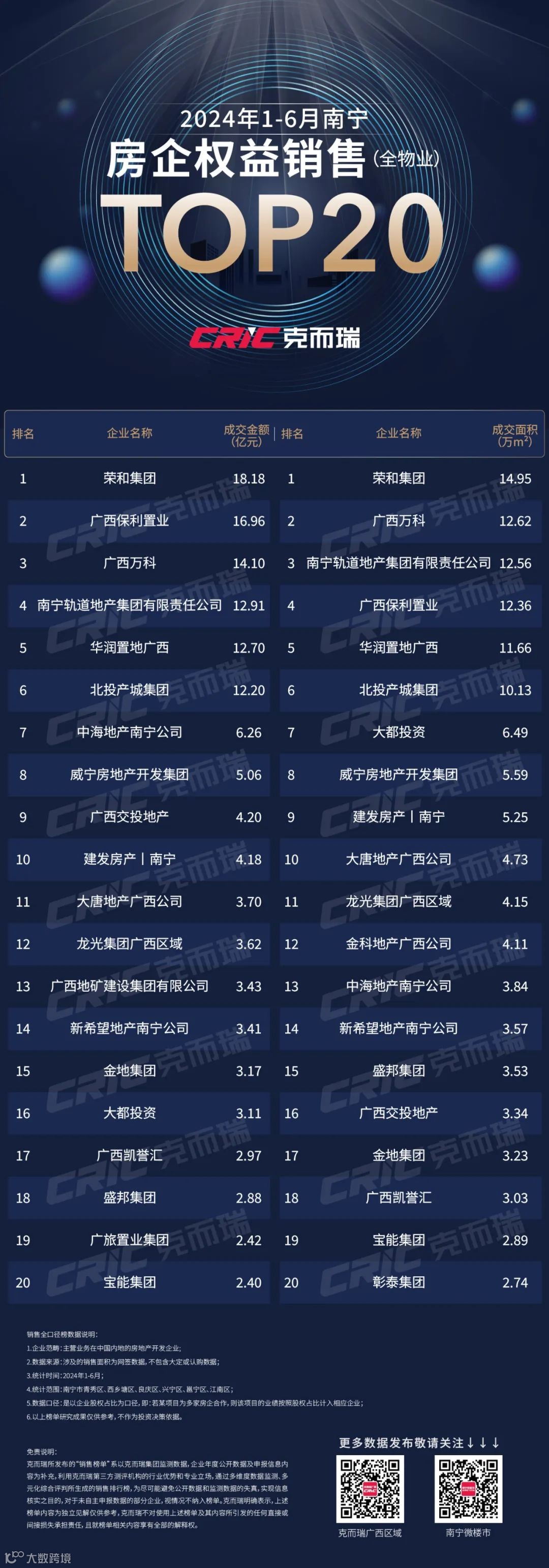 荣耀加冕,实力见证。从全物业维度来看,荣和集团以20亿元,斩获南宁房企全口径销售金额(全物业)TOP1!以18.18亿元、14.95万㎡,夺得2024上半年南宁房企权益销售金额/面积(全物业)TOP1!