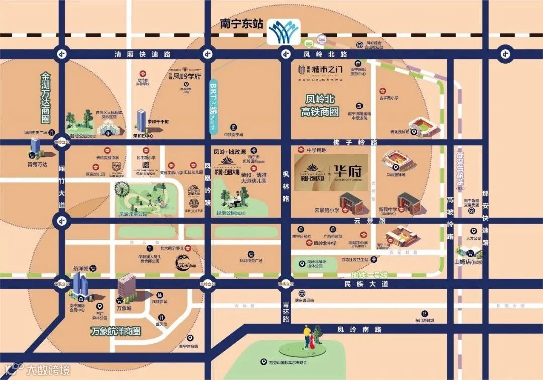 凤岭北自诞生之日起,便是高起点、高规格打造。经过20多年高速发展,居住、商业、教育、景观、交通等均成熟呈现,50多个精品住宅小区相继入住,环保厅、南宁日报社等10多家机关单位驻扎,区域内汇聚几十万高收入群体,消费实力强劲、商机巨大。