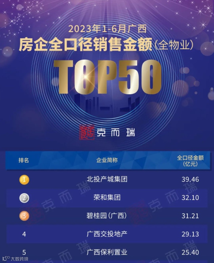 近日,国内权威的房地产信息数据发布平台——克而瑞(广西)发布了2023年上半年50强系列榜单,从榜单中可以看到,荣和集团,以32.10亿元拿下广西房地产企业全口径/权益销售金额排行双榜TOP2,并登顶南宁房企全口径/权益销售套数TOP1,同步达成南宁民营房企上半年销售榜6连冠。同时,荣和集团还取得上半年柳州房企榜单销售金额TOP2和销售面积TOP1。此外,荣和集团也是广西仅有的2家业绩突破30亿元大关的房企之一,足以证明荣和集团的强劲实力!