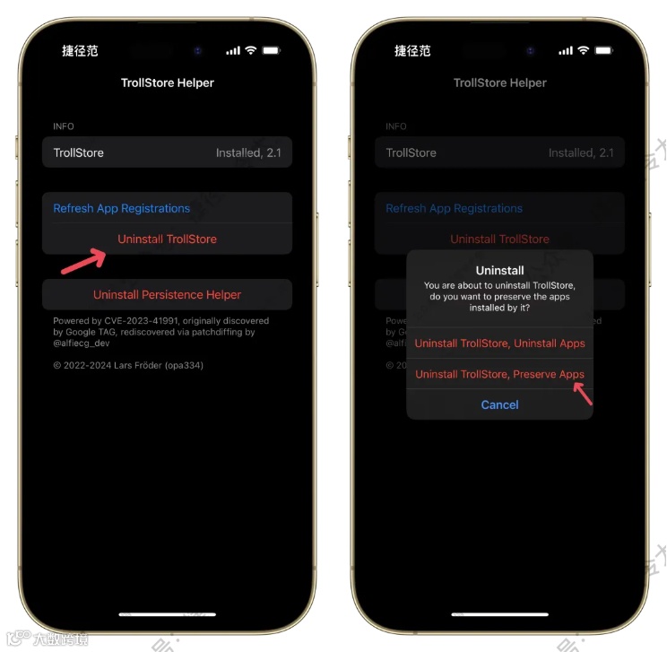如果安装了增强版巨魔直接闪退了,巨魔打不开的情况下,打开持久性助手(前提是已经安装了持久性助手),选择卸载巨魔,而不卸载用巨魔安装的应用,然后再次安装巨魔即可。