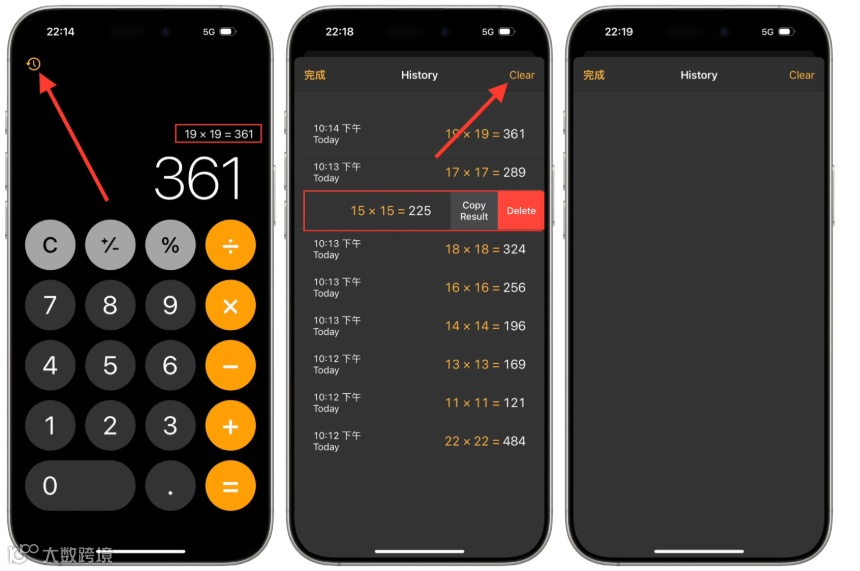 左滑可选择复制结果或者删除,点击右上角的“Clear”可将所有历史都清除。