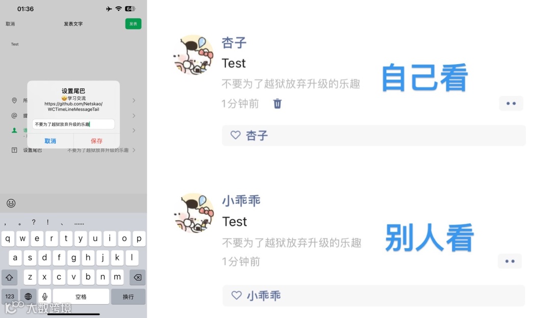 使用简单,在发朋友圈的时候能看到设置尾巴!