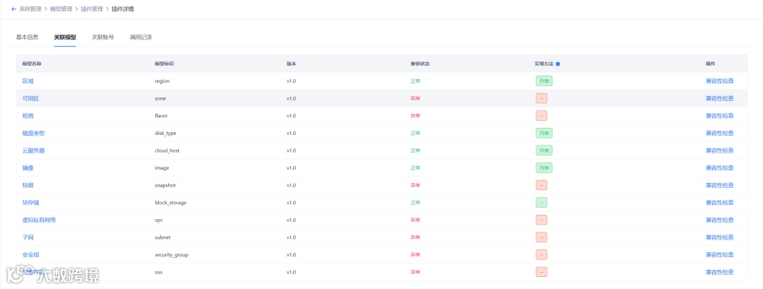 插件的关联模型信息声明了插件适用的模型,多云管理中心定义了多种标准模型,插件并不需要实现所有模型的转换,只需根据其对接的云平台转换部分模型及模型的操作即可。