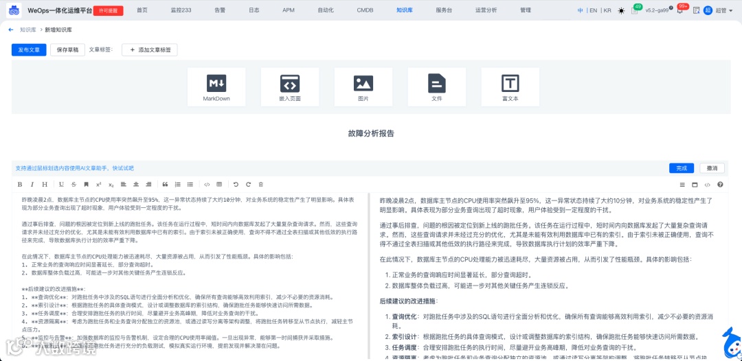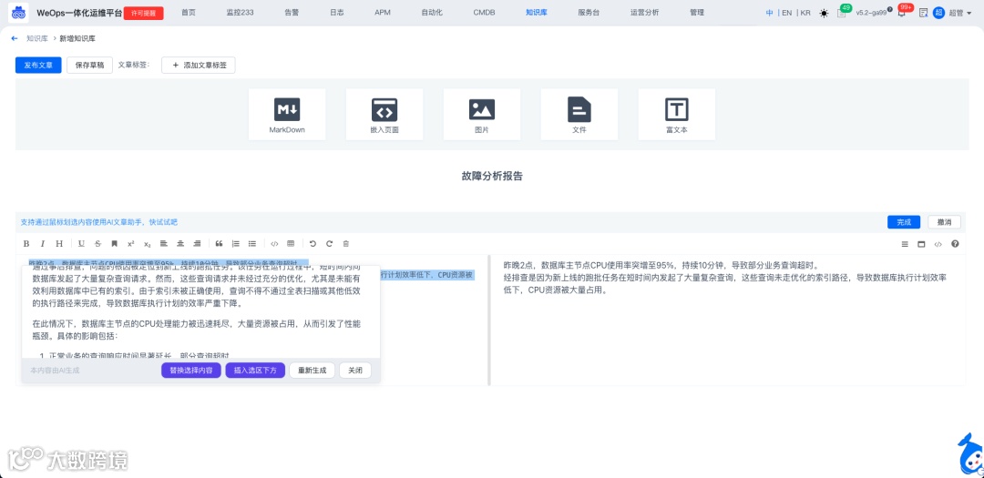 在日常运维工作中,文档处理往往需要耗费大量时间。WeOps推出智能文章助手,支持用户通过划选内容快速实现扩写、总结、优化等操作,一键生成专业文案。无论是技术报告、故障分析还是知识库维护,都能帮助运维团队提升文档处理效率,让信息传递更清晰、更高效。