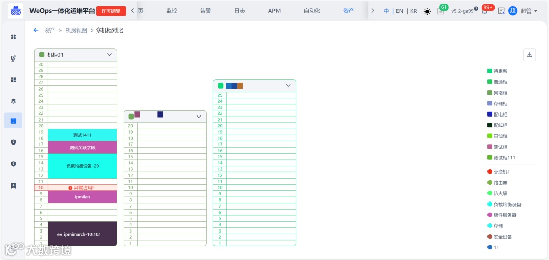 在机房资源紧张时,运维团队常常需要反复核对多个机柜的剩余空间和承重情况。WeOps推出的机柜对比视图功能,支持多机柜并行展示,可直观呈现设备分布、U位占用等关键信息。管理员可一键对比多个机柜资源情况,快速锁定最优上架位置,有效提升机房空间利用率,告别"选择困难症",让IT资产管理更科学、更高效。