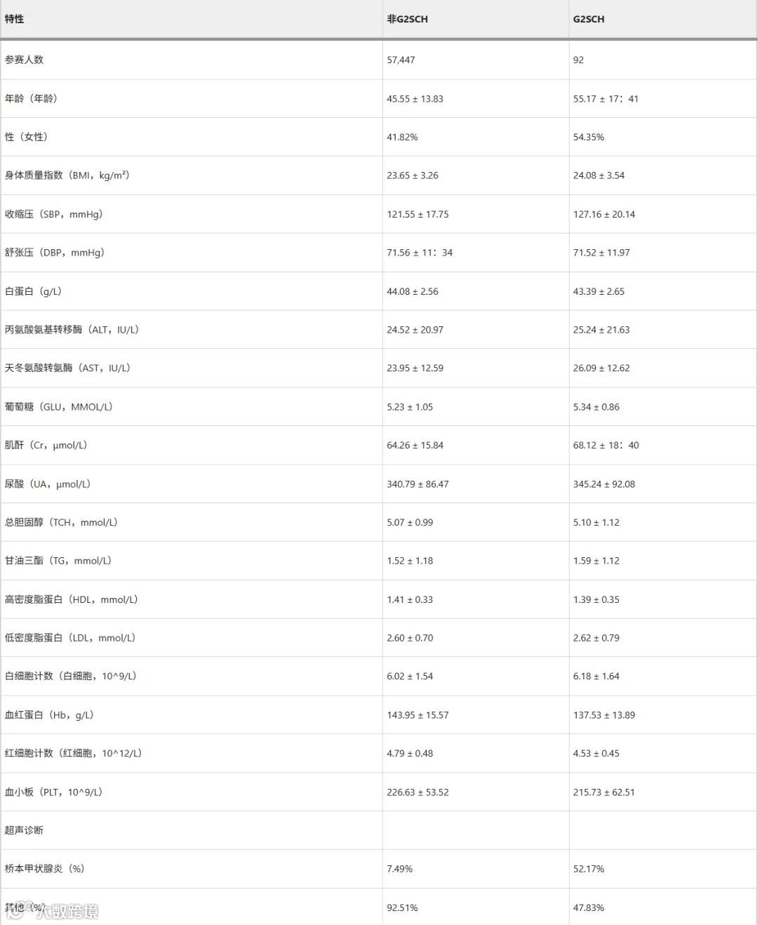 2019-2020 年浙大二院解放路院区收集 57,539 份体检记录,其中 92 份为 G2SCH 型,其与非 G2SCH 个体特征详见表 1。