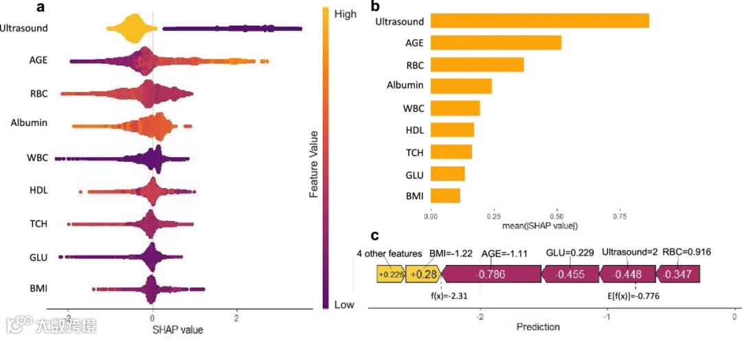 SHAP 分析揭示模型中 G2SCH 的预测变量影响,图 4 显示超声、AGE、红细胞为核心预测因子,白蛋白等亦具显著预测价值。