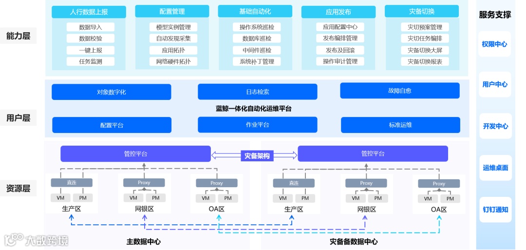金融关系着千家万户,业务连续性要求也愈来愈高,该行定期会进行多次数据库切换和应用切换的灾备切换演练场景,对灾备切换演练场景的运维需求也逐步深化。为此,落地了专门面向切换演练场景研发的嘉为蓝鲸灾备切换管理中心,实现银行业务数据中心级灾备切换。