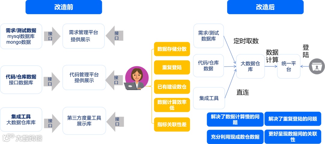 通过接入需求管理、代码管理、集成管理和测试管理系列工具的数据,系统能够自动采集数据并处理这些数据,最后将它们存放在统一的数据库中。这种方式依靠大数据库的数据处理能力,解决了数据处理效率低、加载速度慢、数据分散导致的数据关联性差等问题。