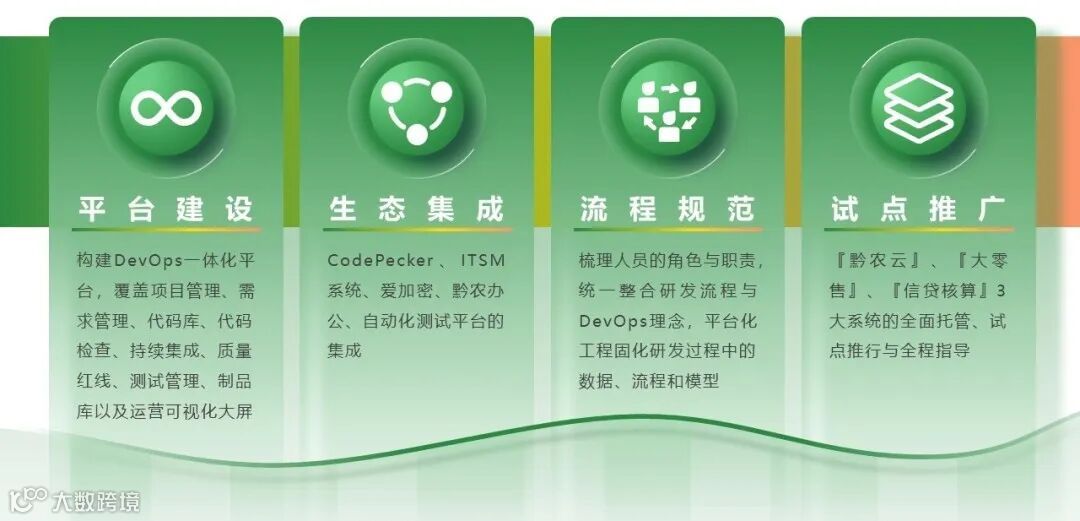 通过嘉为蓝鲸DevOps专家组的专业指导和重点推进,完成了『黔农云』、『大零售』 、『信贷核算』 3大重点系统的全面托管、试点推行与全程指导,通过战略级项目的DevOps转型范例,以点带面推动贵州农信DevOps全面改革。