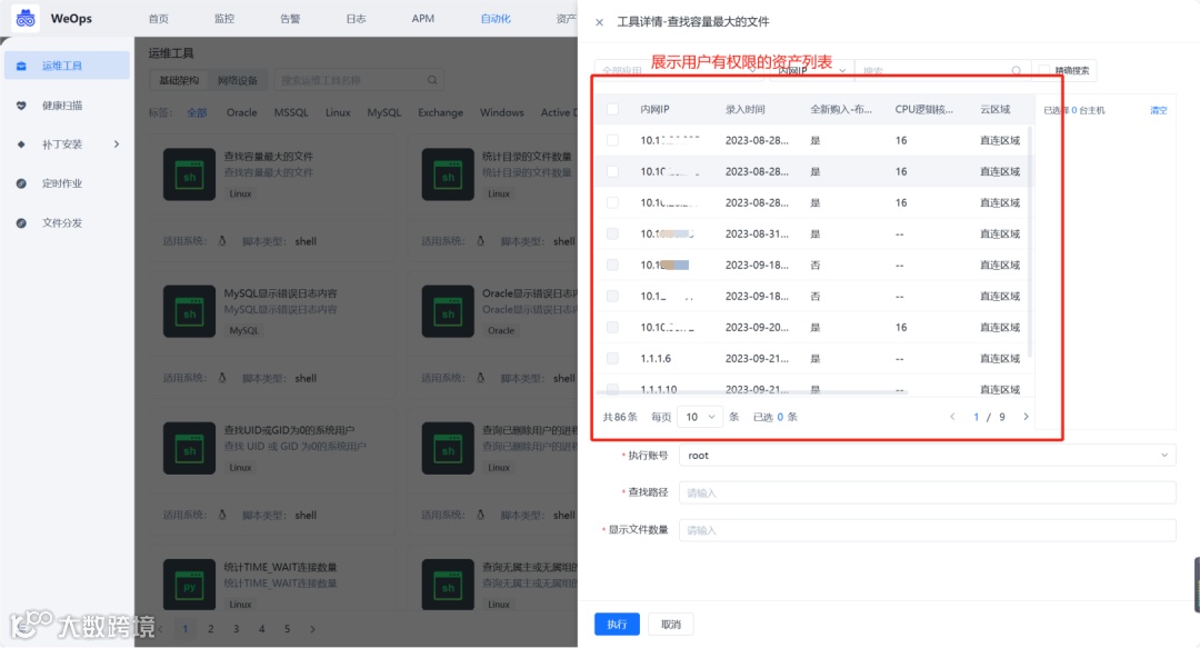 在资产管理、监控管理和自动化模型的资产展示和操作方面,按照有权限的资产实例进行展示和使用