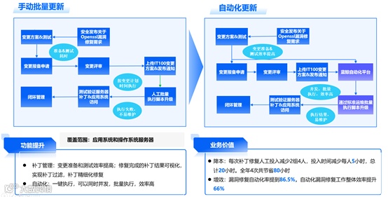 同时,平台将漏洞整改过程的多个人工参与环节串联起来,从漏洞扫描发现、筛选分工、核查通报、执行整改、复核总结的多个人工参与环节,通过自动化工具替代了人工逐台修补,漏洞修复自动化率提到86.5%,自动化漏洞修复工作整体效率提升66%。,保障了应用系统的安全稳健运行。