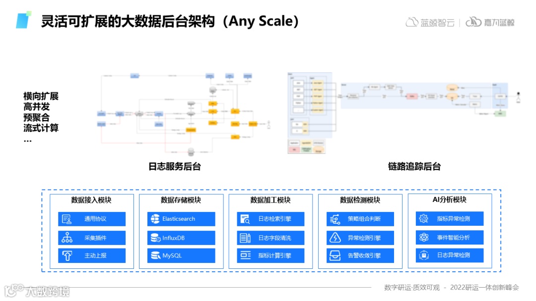通常在做可观测时,都会面向一个非常大的系统,与传统局域网集群和单体监控不同,我们所面临的主要问题并不是稳定的指标数据,而是相对变化频繁的Logs,Traces数据,随着业务系统调用量的变化,如流量洪峰时,系统的数据压力就非常难以预测。所以,建立背后可弹性支持海量数据、能够扛住流量洪峰的后台架构,是系统稳定的重要保障。