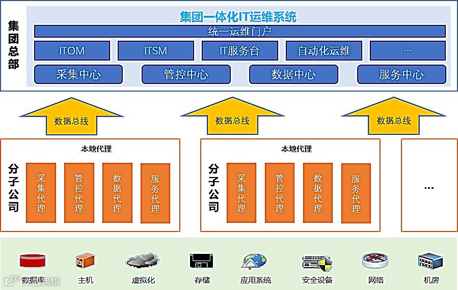 每个分子公司部署本地代理服务器,实现对本地IT数据中心的基础设施和应用系统的监、管、控,同时通过数据总线与集团总部的一体化IT运维系统集成: