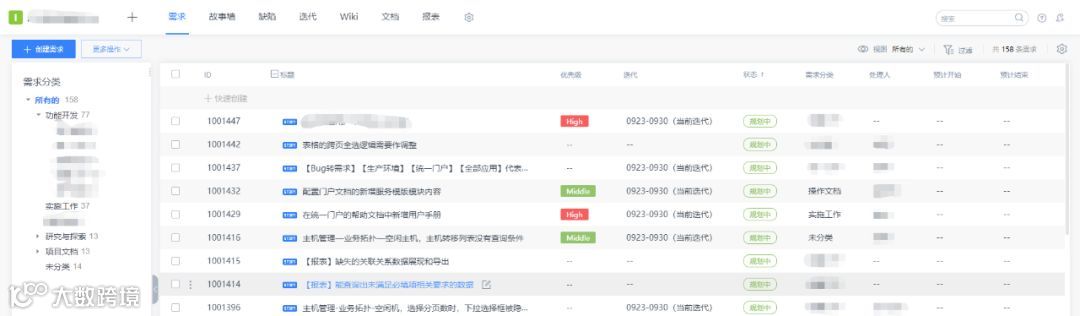 需求清单主要记录产品的功能需求、技术研究、以及非功能性需求等,通过需求分类进行归类管理,还可以通过子需求的方式对粗粒度的需求进行分解和细化,对优先级的设置对需求项进行排序,另外也可以自定义视图来筛选指定范围的需求项,主要界面如下: