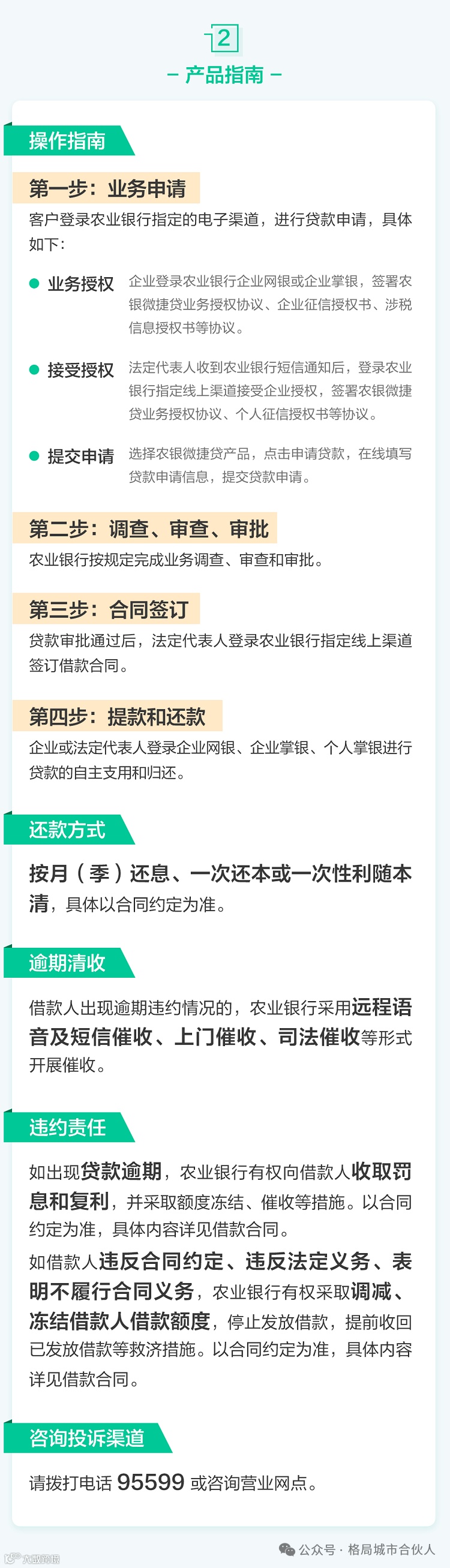 导读:“农银微捷贷”是指中国农业银行推出融资产品,为小微企业及其法定代表人提供在线自助循环信用贷款服务。主要依据客户的涉税、工商、征信以及在农业银行的行为数据等信息作为评估依据,帮助客户快速获取信用贷款支持