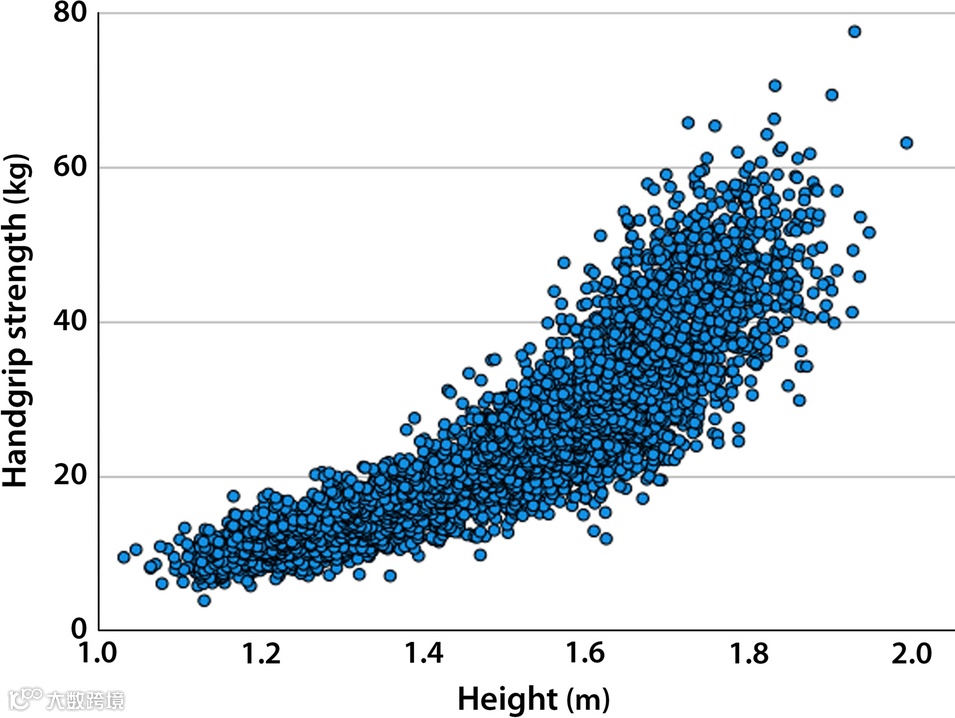 图1 握力(千克 [kg];无论手如何都达到最高分)和身高 (m) 之间的关联。