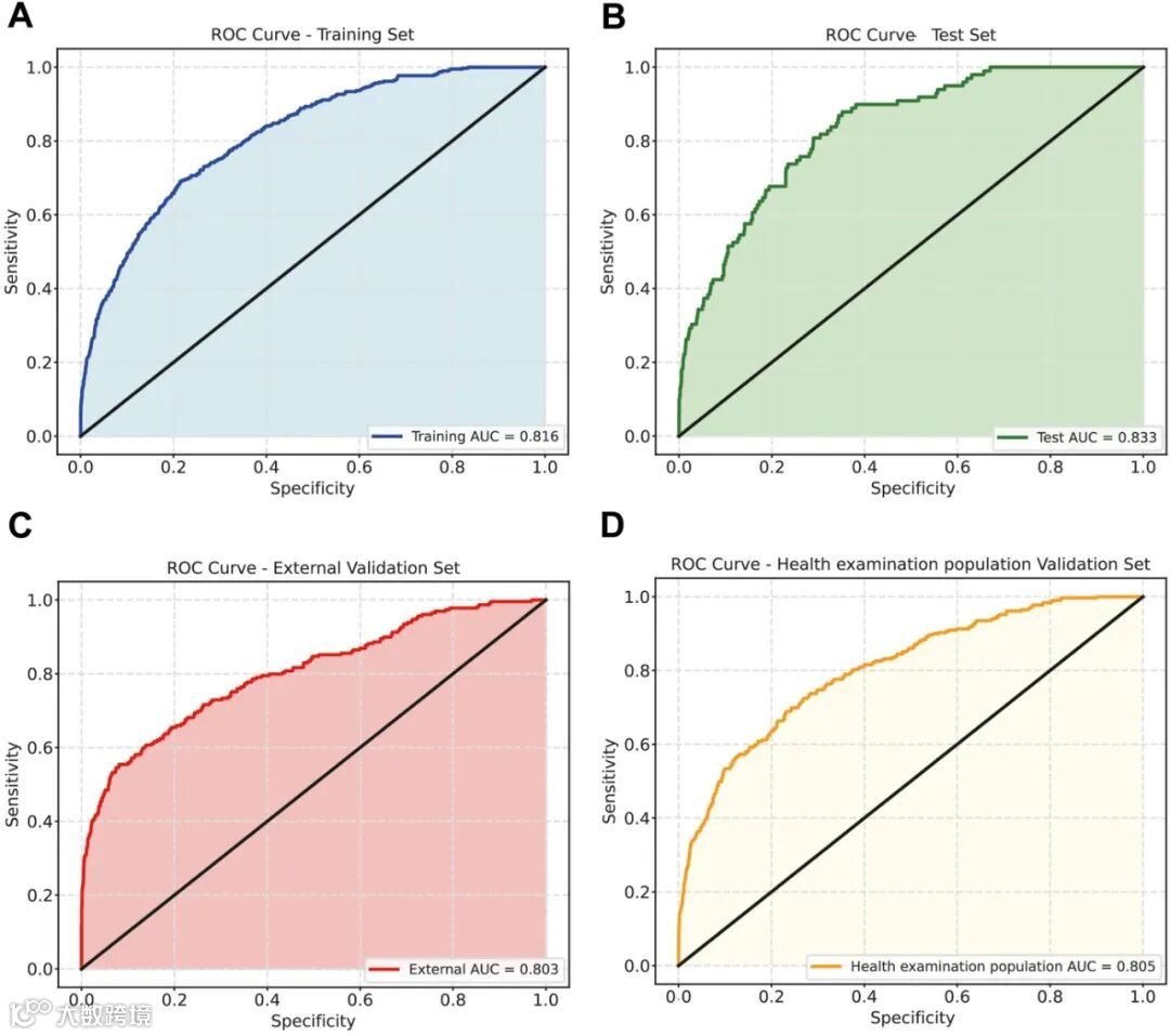 图 3 展示堆叠 ML-TyG.BMI 模型预测脑卒中性能:A-B 为内部门 / 测试集、C-D 为外部测试集 1-2 的 ROC 分析。
