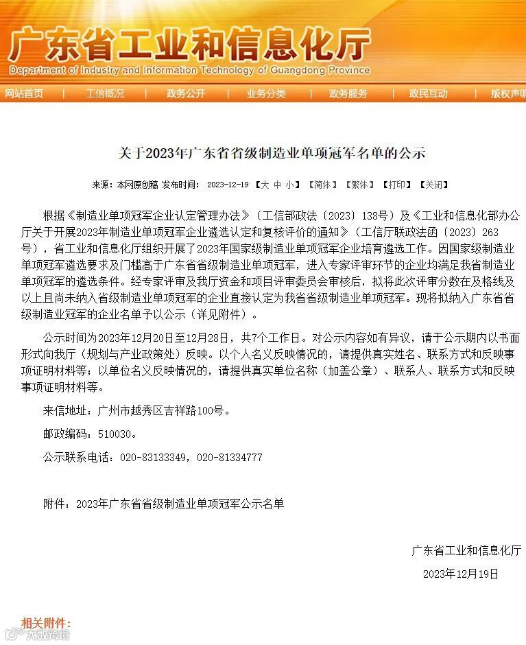 ▲广东省工业和信息化厅官方网站上发布的《关于2023年广东省省级制造业单项冠军名单的公示》