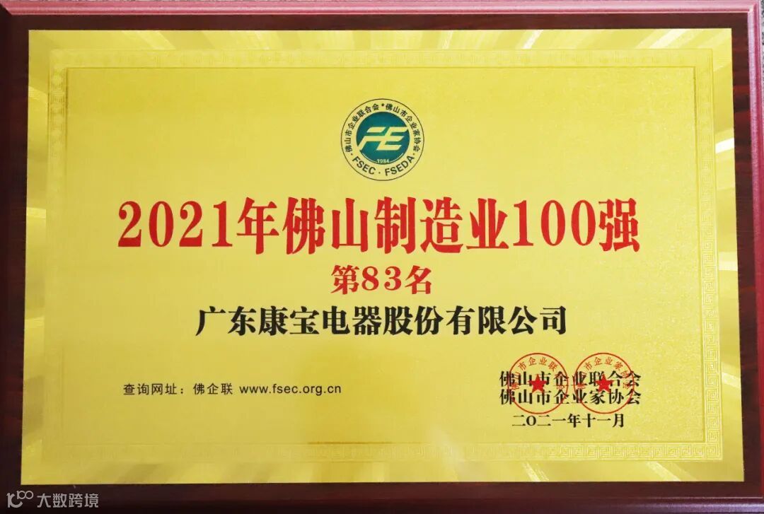 康宝荣膺“2021年佛山制造业100强”称号