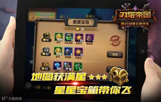 在《刀塔帝国》中,副本分成三个难度等级,每通过一个等级获得一颗星。当玩家在一幅大地图拿满三十颗星,即可领取3个星星宝箱,其中金宝箱可以获得大量钻石、英雄印记及经验药水奖励。