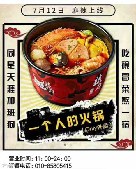 营销初期,北京辣府建国路店,特推出了“一个人的火锅”——冒菜外卖,并入驻了各大外卖平台,在已有品牌知名度的基础上,北京辣府建国路店的主要业务需求是新品推广和吸引客流,让更多的人知道辣府开始送外卖了,让更多人想吃火锅却没人约的时候,能想起辣府“一个人的火锅”!