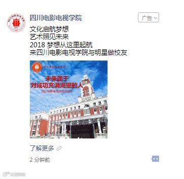 四川电影电视学院在专业上是有一定优势的,近年来明星效应的现象越来越普遍,可以很有效的吸引大部分学生的关注,因此在招生季利用合适的方式进行宣传,以学校的环境和知名明星进行宣传学校、引导用户,朋友圈广告是比较合适的选择,主动展现,加深用户记忆,提升学校知名度。